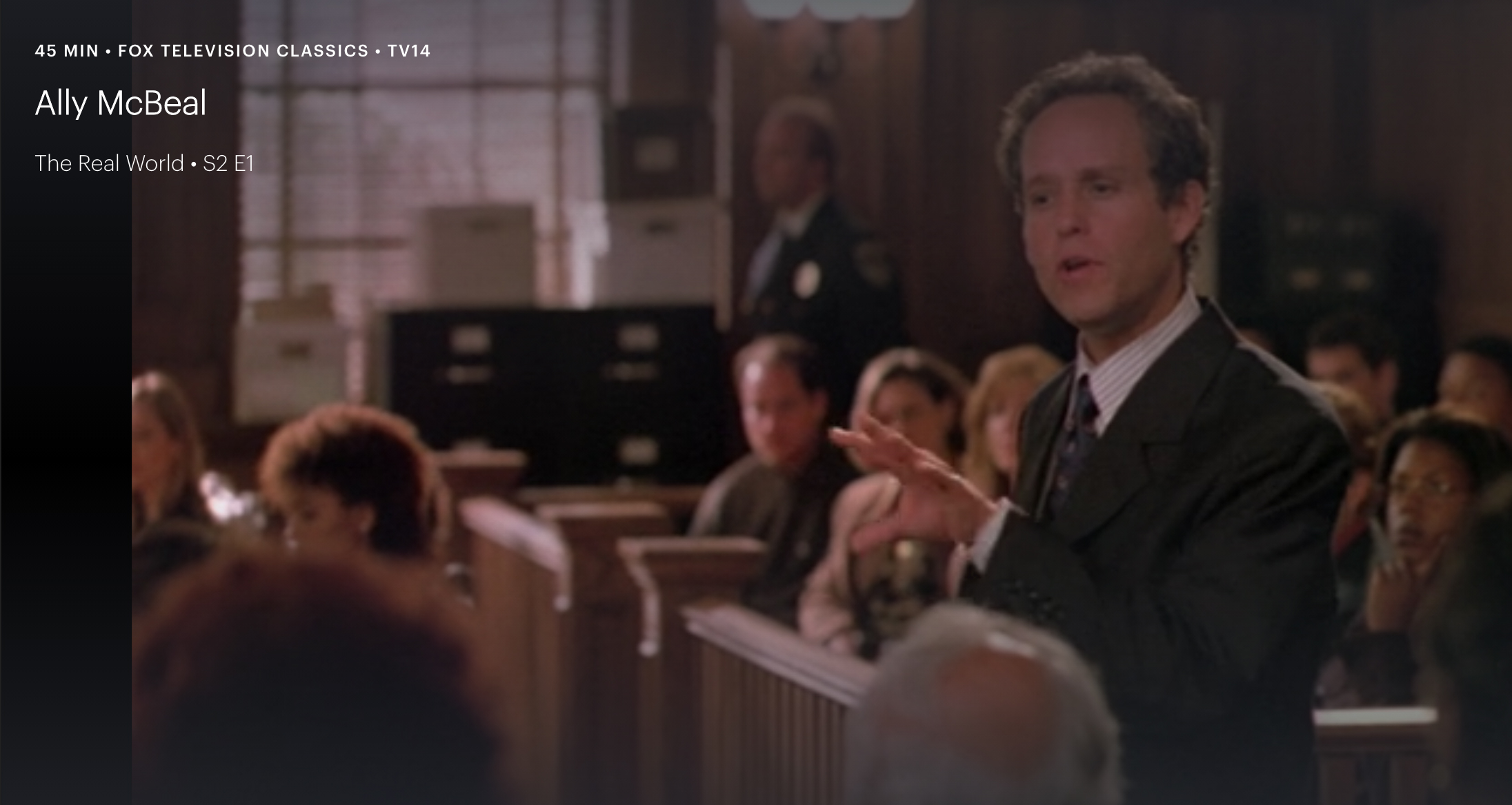 2. Ally McBeal S2E1: The clip is a defense attorney closing. The episode is Season 2, Episode 1 of a show called Ally McBeal. This clip isn’t on YouTube so you can only watch it on Hulu (unless your mom has the whole series on box set).